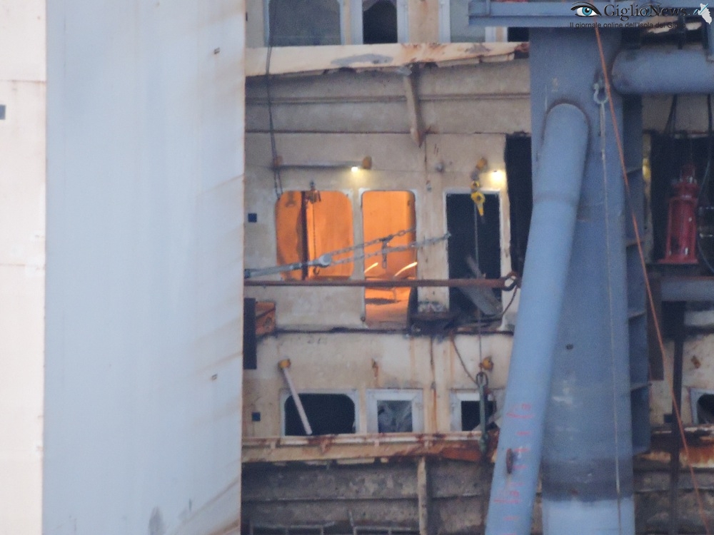 Riguardo i lavori svolti ieri ci sono due cose che si notano nel video: a muovere Concordia di prua è (apparentemente) un piccolo rimorchiatore, anzi quasi un mini pontone con una piccola gru idraulica a poppa; l’altra cosa si vede per un istante all’ultimo secondo del video: il primo cassone dopo gli sponson di prua si solleva di colpo come se si fosse sganciato o allungata la catena.