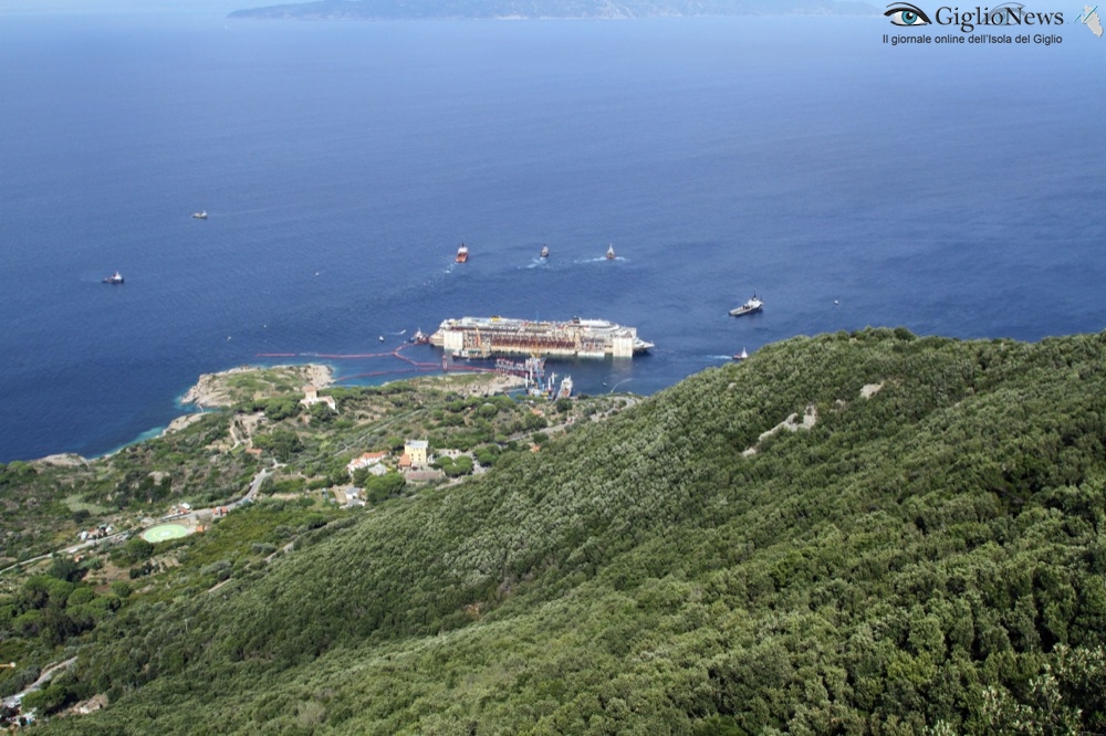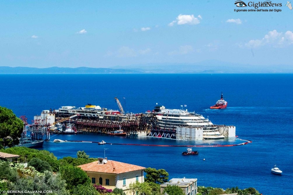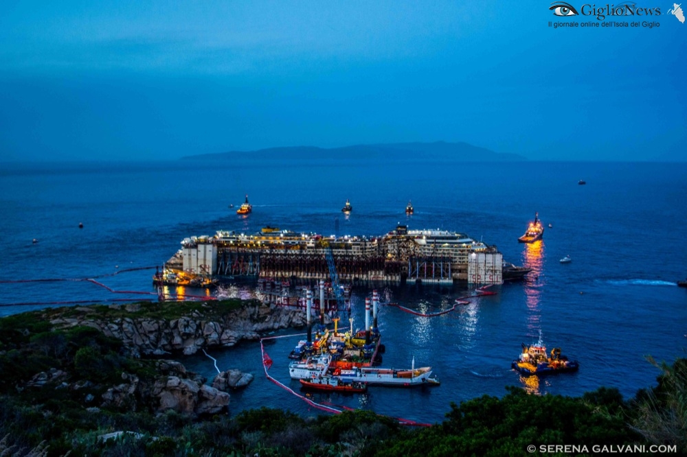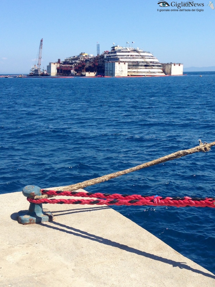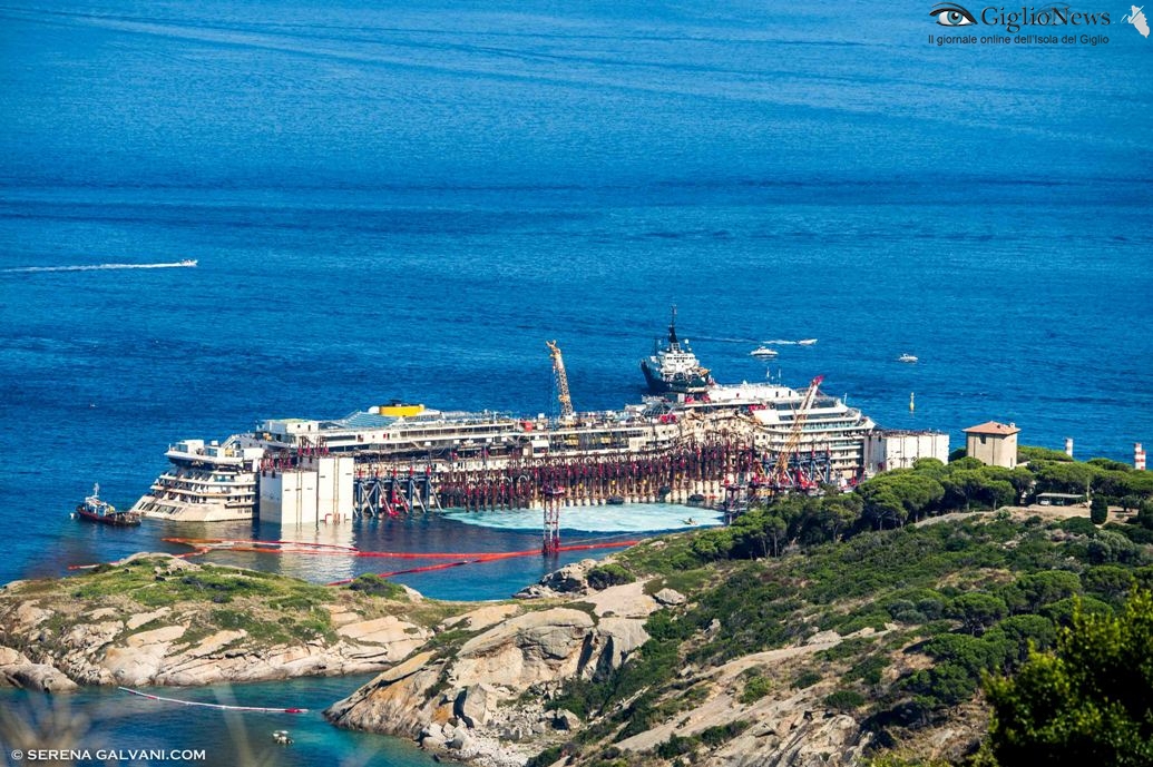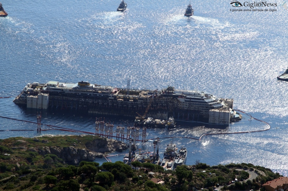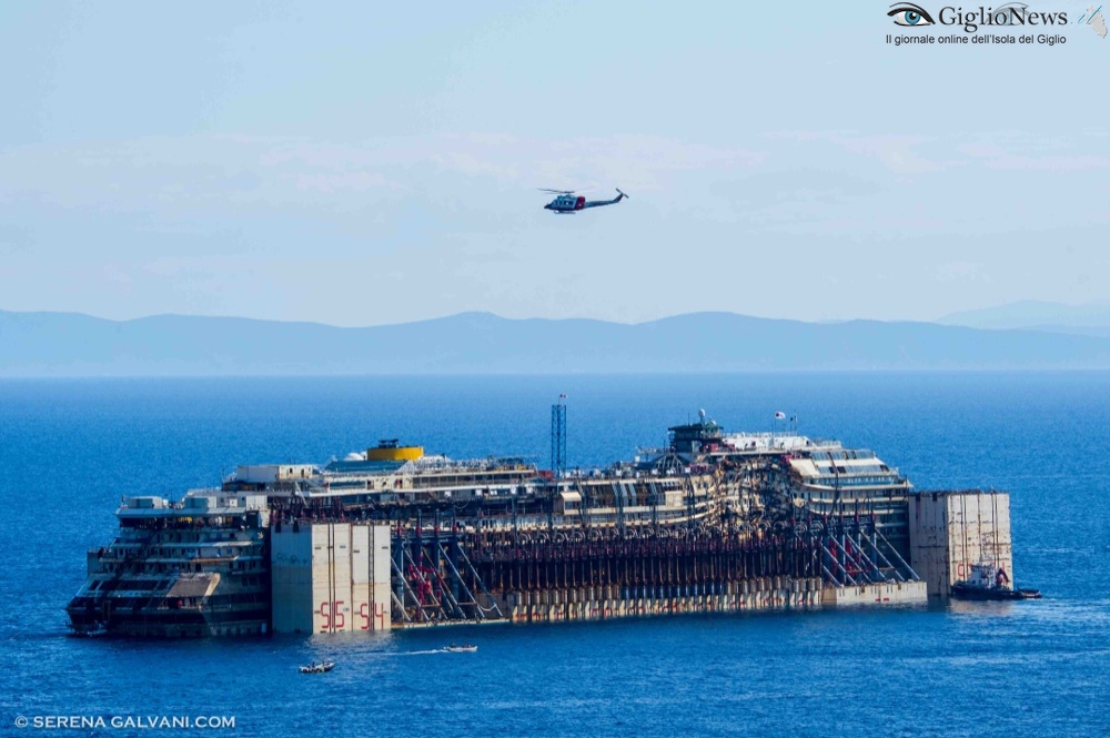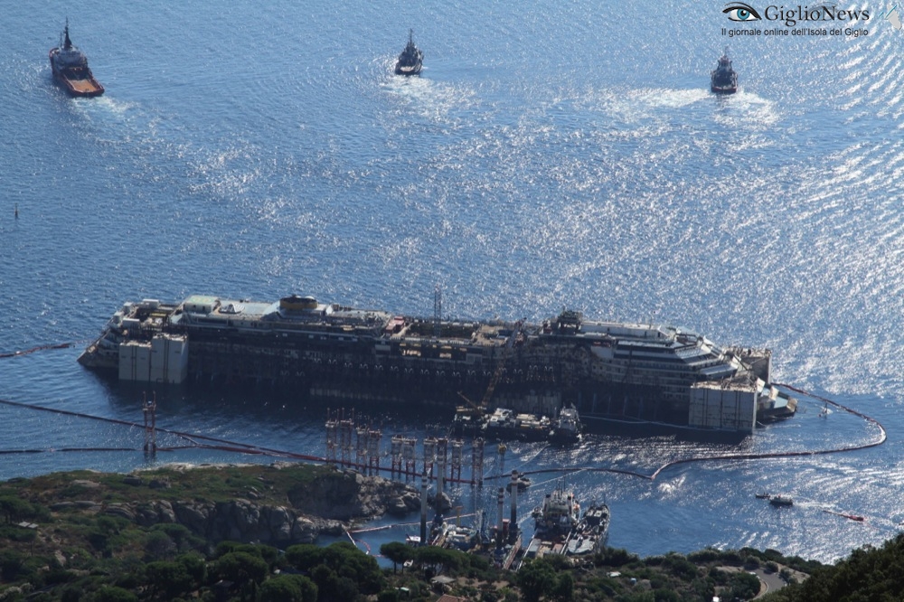 22 Luglio 2014, ore 17 – Tutto è ormai pronto per l’allontanamento della Costa Concordia dalle acque dell’Isola del Giglio. Sono ufficialmente terminate le operazioni di rigalleggiamento e la nave ha toccato la quota di 17,50 metri di pescaggio prevista dal contratto e questa sera sarà assettata da Nick Sloane ed il suo team al pescaggio previsto per la navigazione.