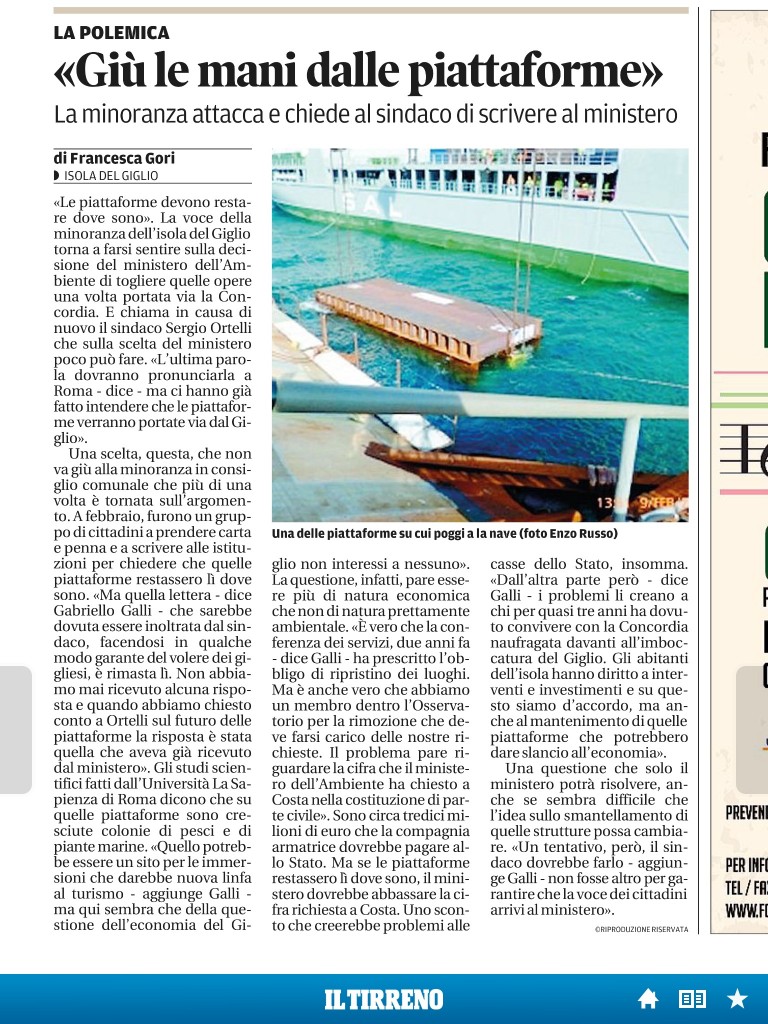 La collega de Il Tirreno Francesca Gori ha affrontato per 2 giorni il dibattuto tema sul suo giornale. Vi proponiamo di seguito il testo del 4 Luglio scorso con cui si parla della questione e la foto dell'articolo del 5 Luglio con cui la Minoranza consiliare isolana chiede al Sindaco Ortelli di insistere presso il Ministero dell'Ambiente al momento propenso alla rimozione delle strutture dai fondali.