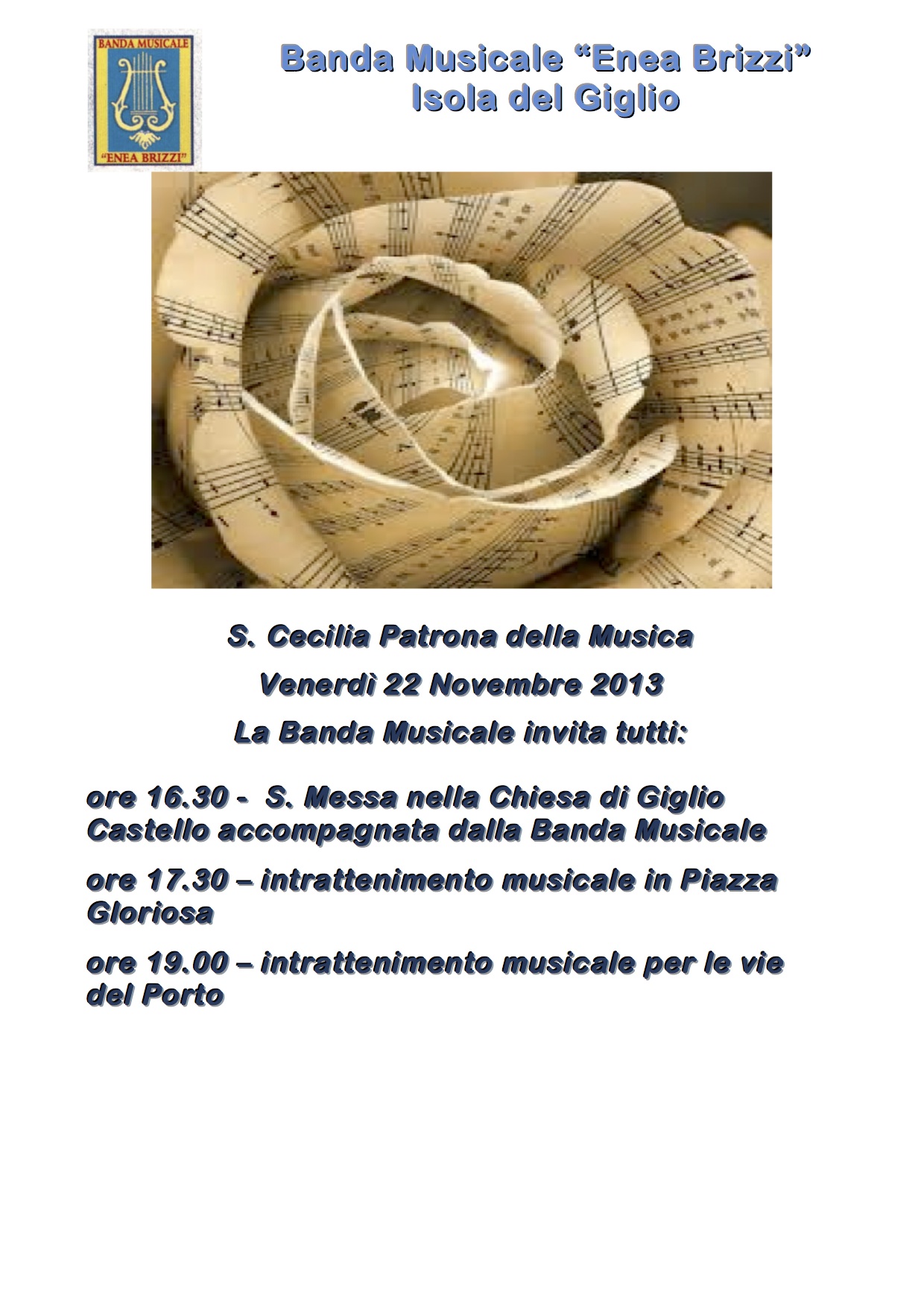 La Banda Musicale "Enea Brizzi" di Isola del Giglio festeggerà insieme alla cittadinanza il prossimo venerdì 22 novembre. In occasione di Santa Cecilia, patrona della musica, dei musicisti e dei cantanti, tutta la popolazione è invitata a prendere parte, insieme ai componenti della Banda, alla celebrazione di una messa nella Chiesa di San Pietro Apostolo a Giglio Castello alle ore 16:30.