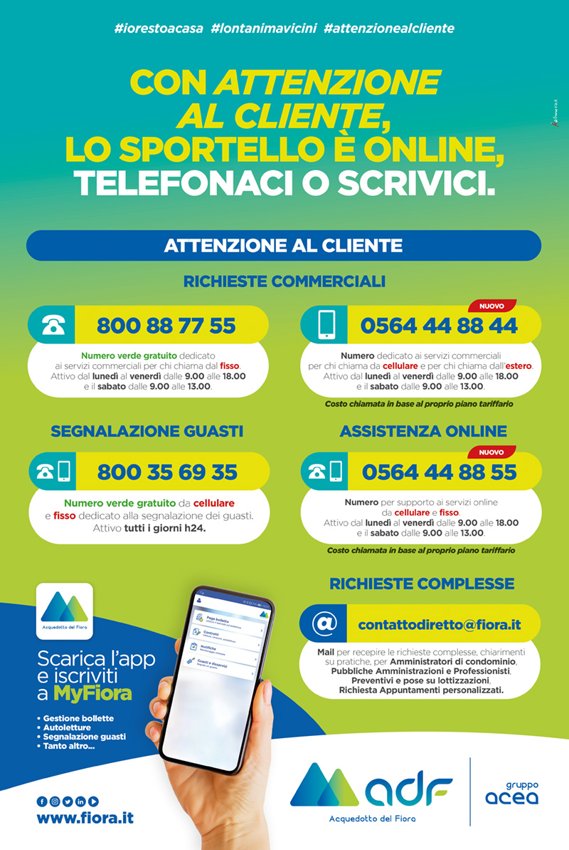 In questo periodo di emergenza legato alle misure di contrasto al contagio da coronavirus, Acquedotto del Fiora ha riorganizzato le sue politiche di "Attenzione al Cliente" attraverso i servizi riassunti nella locandina qui in basso.