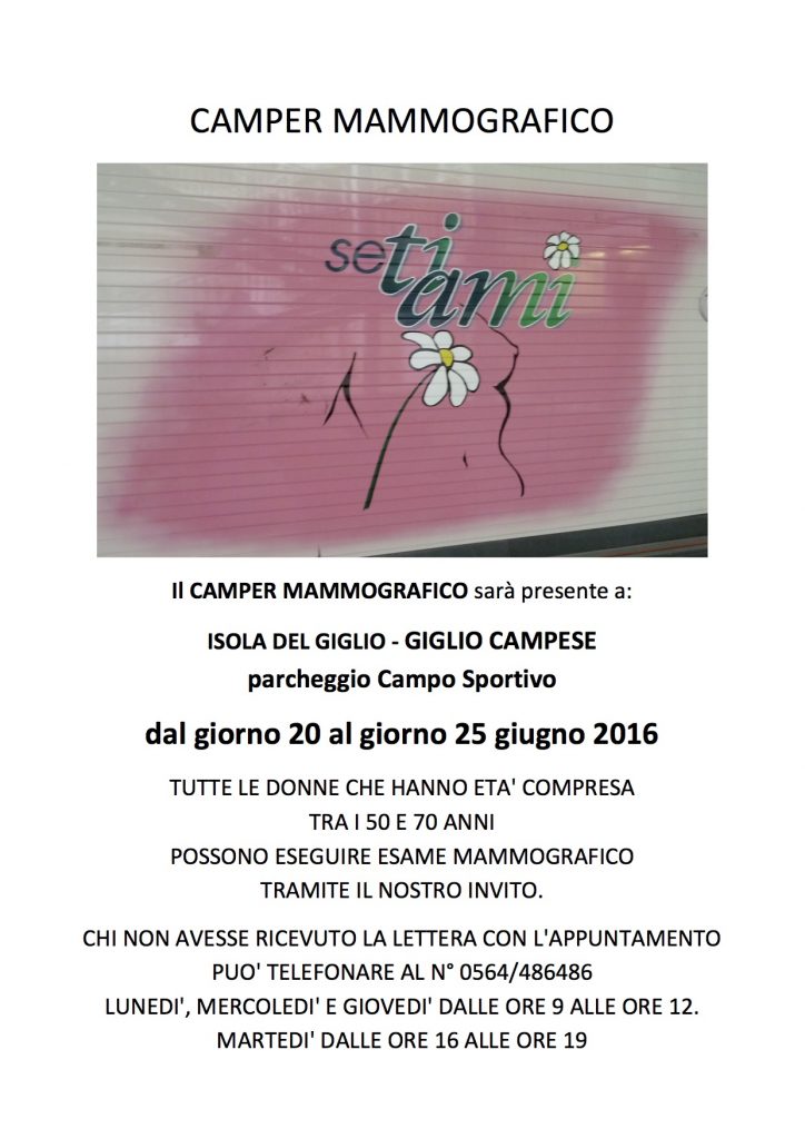 Si comunica la programmazione della sosta del mezzo mobile per lo screening mammografico presso il Comune di Isola del Giglio.