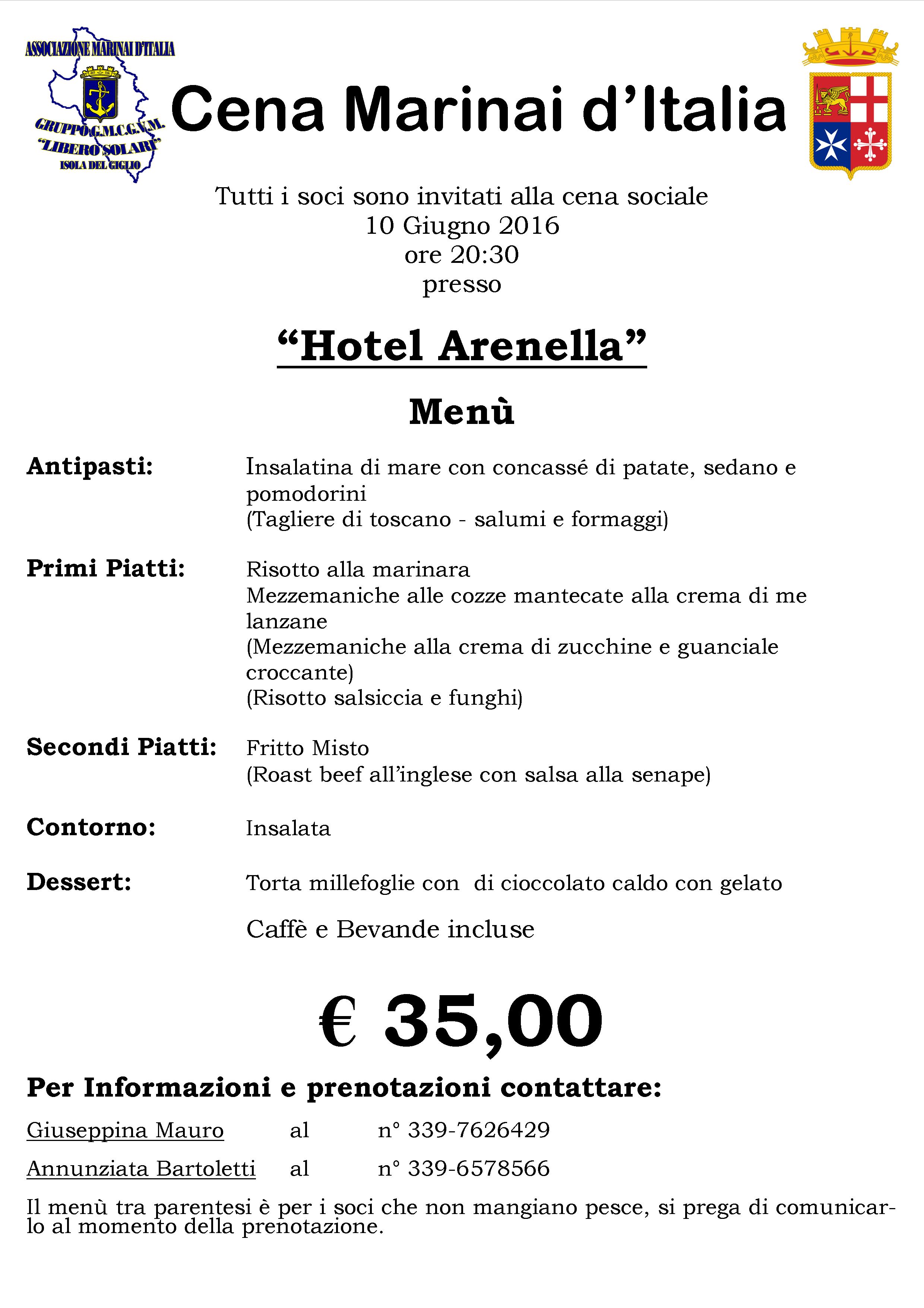 Si invitano tutti i soci e simpatizzanti dell'ANMI Isola del Giglio, in occasione della Festa della Marina del 10 Giugno, ricorrenza dell'Impresa di Premuda, a partecipare alla cena sociale che si terrà presso l'Hotel Arenella.