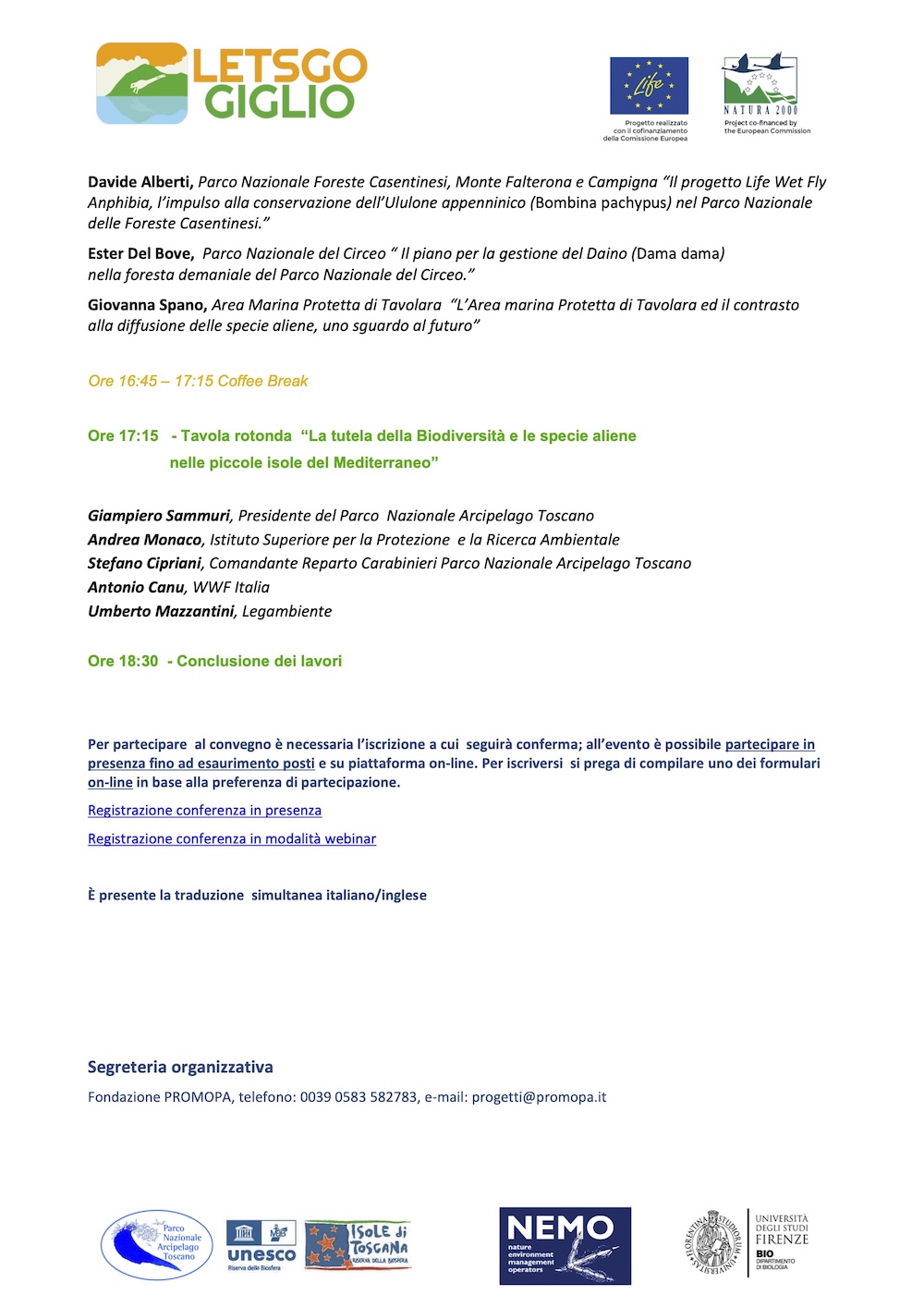 Nella giornata odierna, 23 Ottobre, all'Isola del Giglio presso l'Hotel Bahamas, al via la conferenza finale del progetto Life Letsgo Giglio. I lavori inizieranno alle 14:30 con la registrazione dei partecipanti e proseguiranno tutto il pomeriggio; la seconda sessione nella giornata di domani, giovedì 24, fino alle 18:30.