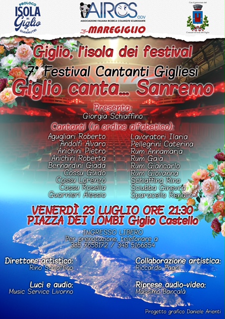 La serata odierna rappresenterà, dal punto di vista dell’impatto tecnico/organizzativo, l’evento principale del Festival musicale e proporrà, come ogni anno, le esibizioni di 16 cantanti gigliesi, con espressioni artistiche diverse fra loro, ma allo stesso, tempo, tutte ugualmente rappresentative della passione che l’isola nutre per la musica ed il canto.