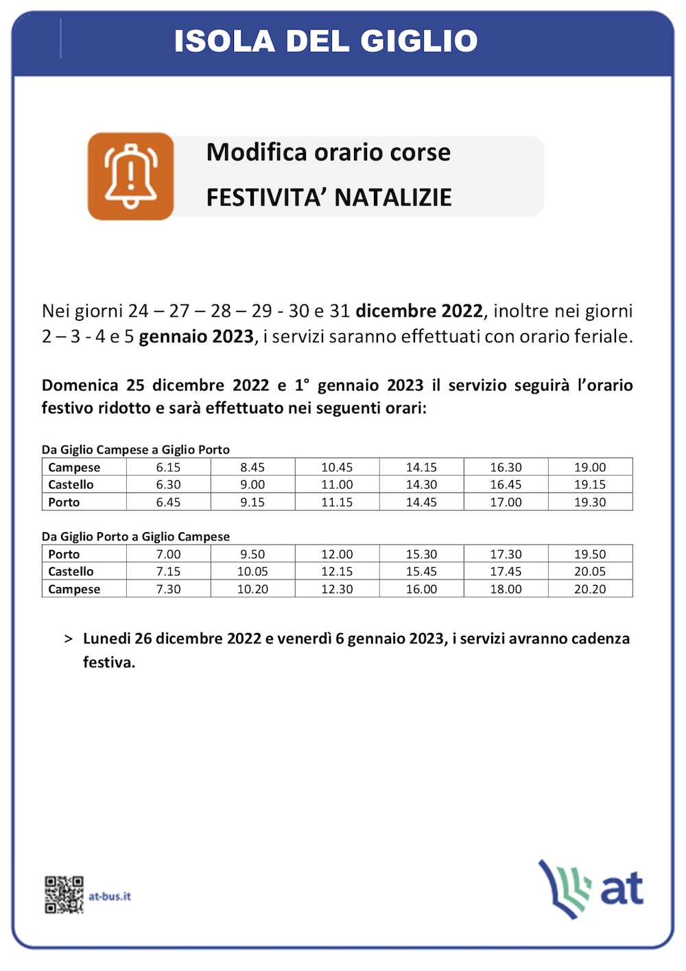 Pubblichiamo di seguito gli orari degli autobus di Autolinee Toscane, che collegano i tre centri abitati dell'Isola del Giglio, in vigore durante il periodo delle festività natalizie. Le tratte ig1A e ig1R coprono rispettivamente i percorsi circolari Campese - Castello - Porto e Porto - Castello - Campese. Il primo prospetto (orario festivo ridotto) riguarda le giornate del 25 Dicembre 2022 e 1 Gennaio 2023. Nel secondo invece l'orario tradizionale che sarà effettuato gli altri giorni secondo il seguente schema: