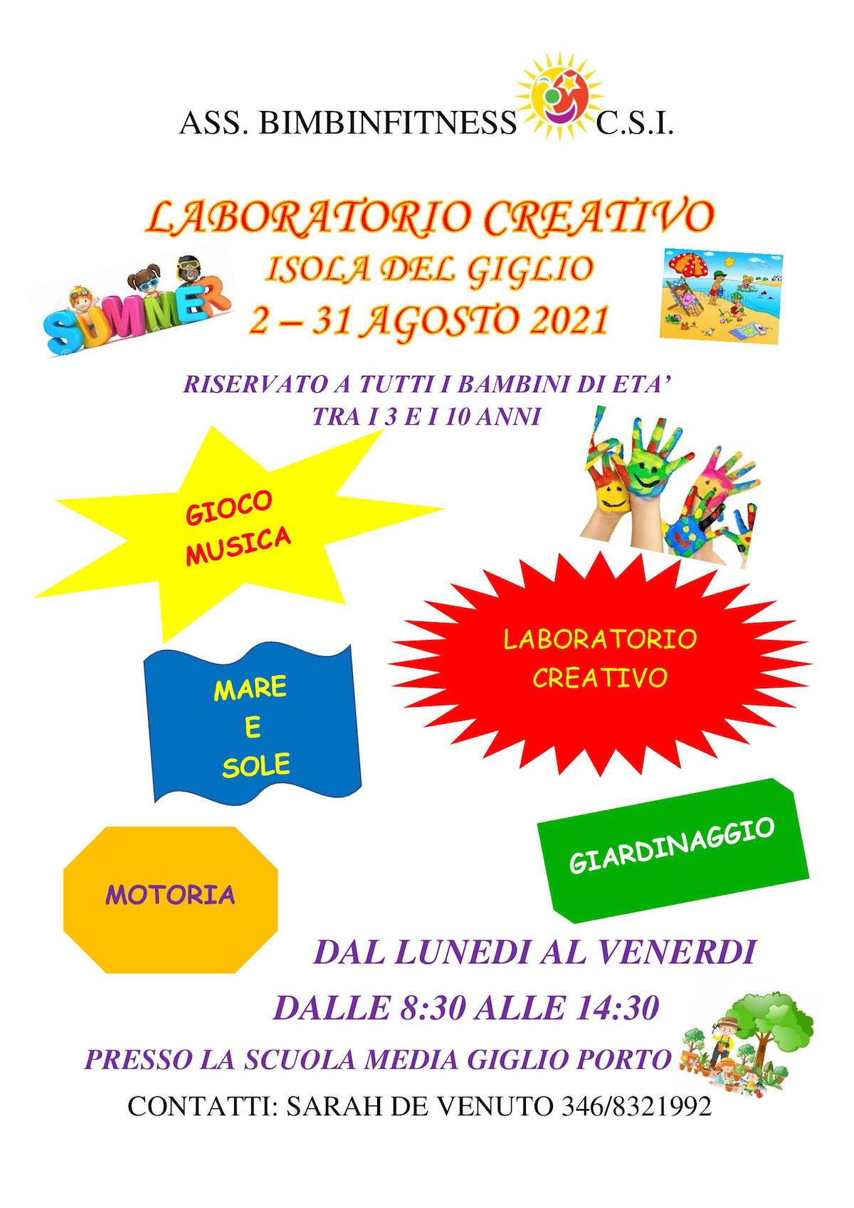 L'Associazione Bimbinfitness presenta un Laboratorio Creativo riservato a tutti i bambini tra i 3 e i 10 anni, dal 2 al 31 Agosto dal lunedì al venerdì dalle ore 8,30 alle ore 14,30, presso la Scuola Media di Giglio Porto. Per maggiori informazioni contattare Sarah al 346 8321992