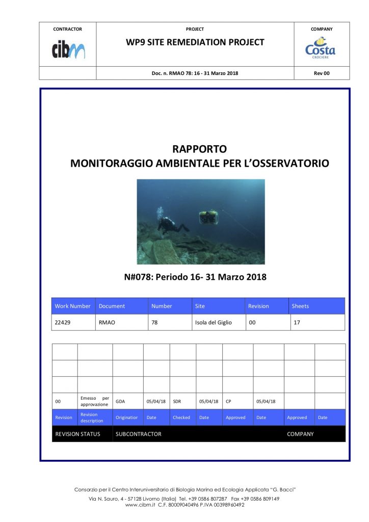Pubblichiamo di seguito la relazione quindicinale, elaborata dal consorzio CIBM (Uniroma) e condivisa con il Project Management della Micoperi, che Costa Crociere invia periodicamente all'Osservatorio per il monitoraggio della Regione Toscana nell'ambito della fase finale del ripristino dei fondali a seguito della rimozione Costa Concordia dalle acque di Punta Gabbianara.