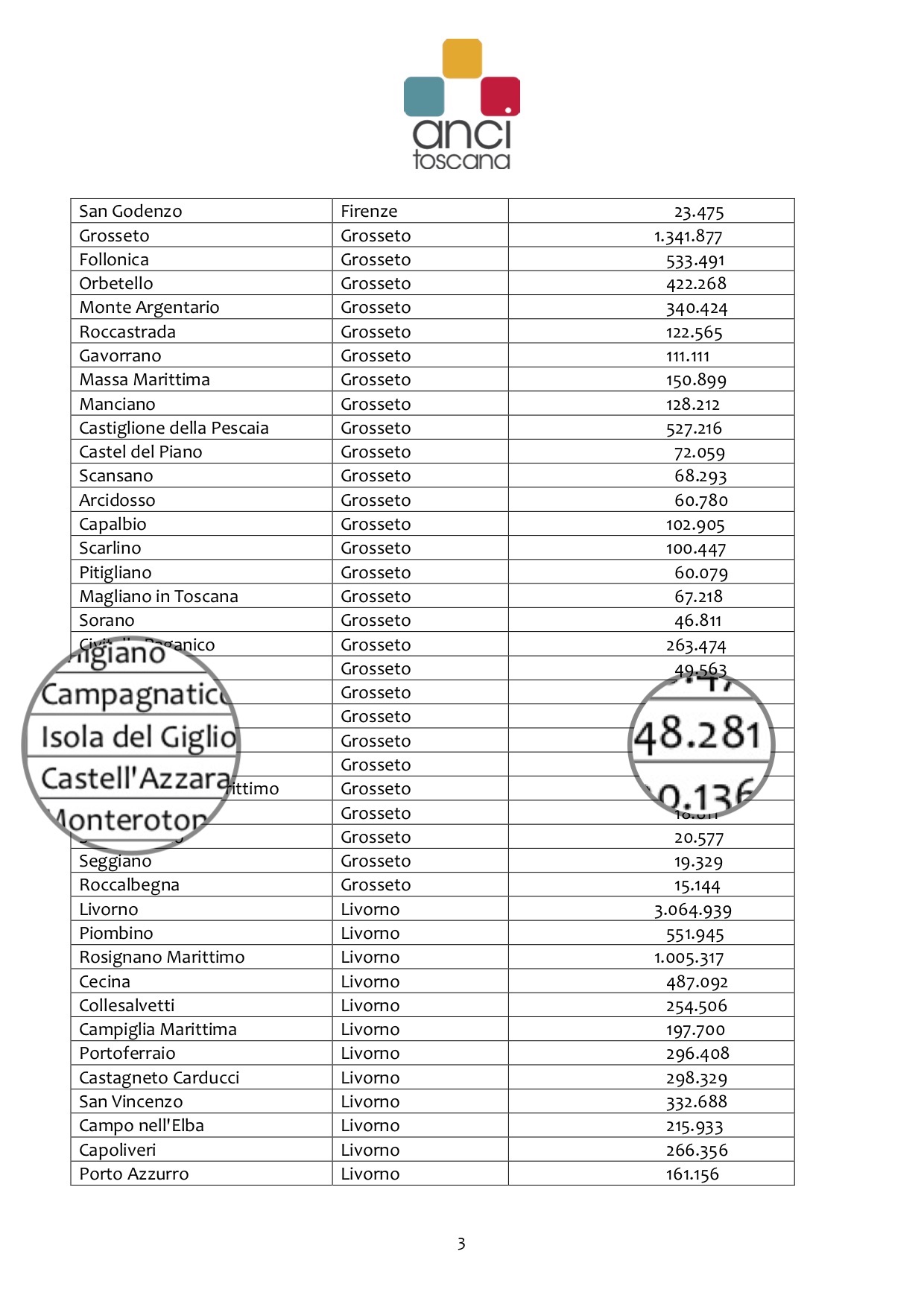 Di seguito la tabella di Anci Toscana con la ripartizione dell'acconto per i Comuni toscani