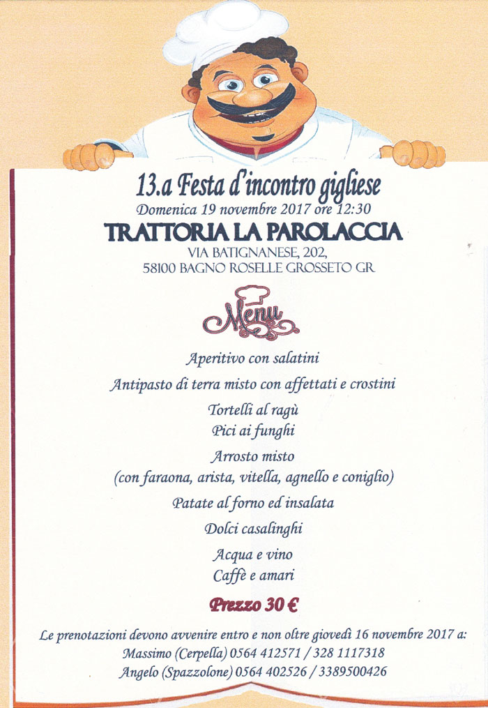 Quest'anno è il nostro maestro Cecchino che nel suo“Sono Gigliese e canto” esalta l'amore: amore per l'Isola e per gli isolani. E amore condiviso da tutti noi nel convivio che ci vedrà ancora una volta insieme domenica 19 novembre alle h 12.30 presso la trattoria “LA PAROLACCIA” in quel di ROSELLE (Gr).