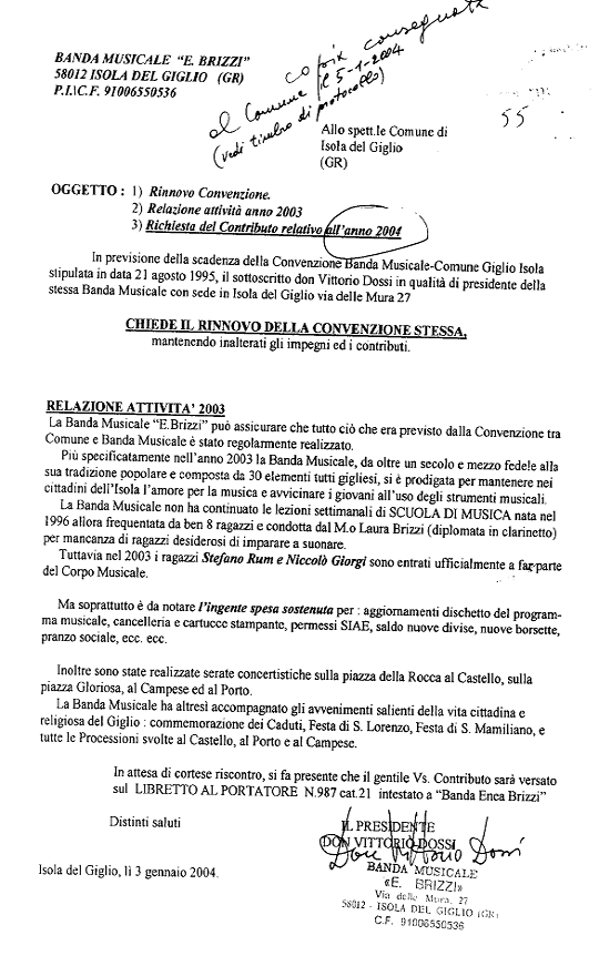 “Il mio sfogo personale, non da consigliere ma da gigliese che ama la banda, è lo stesso di chi, assieme a me, ha contribuito a far crescere la nostra isola attraverso le note della nostra filarmonica. Ho voluto attendere il 31 dicembre 2004, ultimo giorno in cui si possono impegnare somme in bilancio, per essere certo di qualcosa a cui non avrei mai voluto credere: durante l'ultimo Consiglio Comunale è stato deciso, a colpi di Maggioranza, l'eliminazione dei contributi per la Banda e per i Comitati Festeggiamenti, a vantaggio di stipendi personali che fino a quel momento non erano stati mai percepiti.